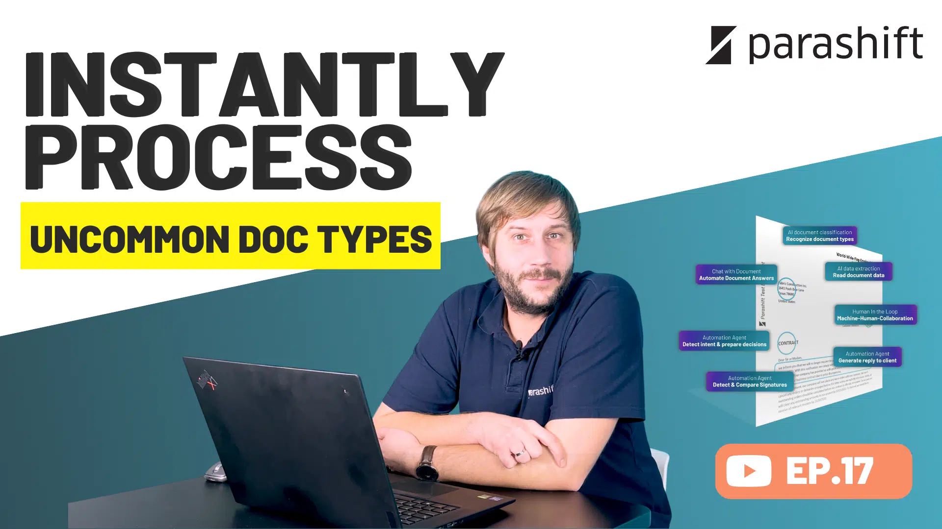 Instantly classify brand‑new document types in Parashift Emma Lebat Parashift Platform May 22, 2025 Stop wrestling with hard‑coded templates and endless configuration. In this short spotlight, Thilo Rossa (Head of Product at Parashift) shows you how *anyone* can go from “never‑seen‑before form” to fully classified, ready‑to‑extract document in minutes. It’s never been easier to classify all your different and varied documents. How to easily classify your documents? – One‑click enablement switch on a pre‑built doc type and the platform immediately starts classifying it. – True no‑code custom types create a bespoke “Super Complex Form” (or anything else) from scratch without touching a single rule or regex. – AI that learns instantly the moment you hit *Live*, the new type is available for high‑accuracy auto‑classification and data extraction. – Human‑in‑the‑loop made easy – jump into the classification view when you want full control, or let confidence scoring bypass it when you don’t. – Lightning‑fast serial mode – validate a whole batch with nothing but your keyboard, cutting review time to seconds per document. Like what you see? Hit 👍 and Subscribe for more deep dives into Parashift features that save you time and keep your data flowing. Questions regarding the Parashift Platform or Document Processing in general, just contact us, we will be happy to help you. Share on Facebook Share on Twitter